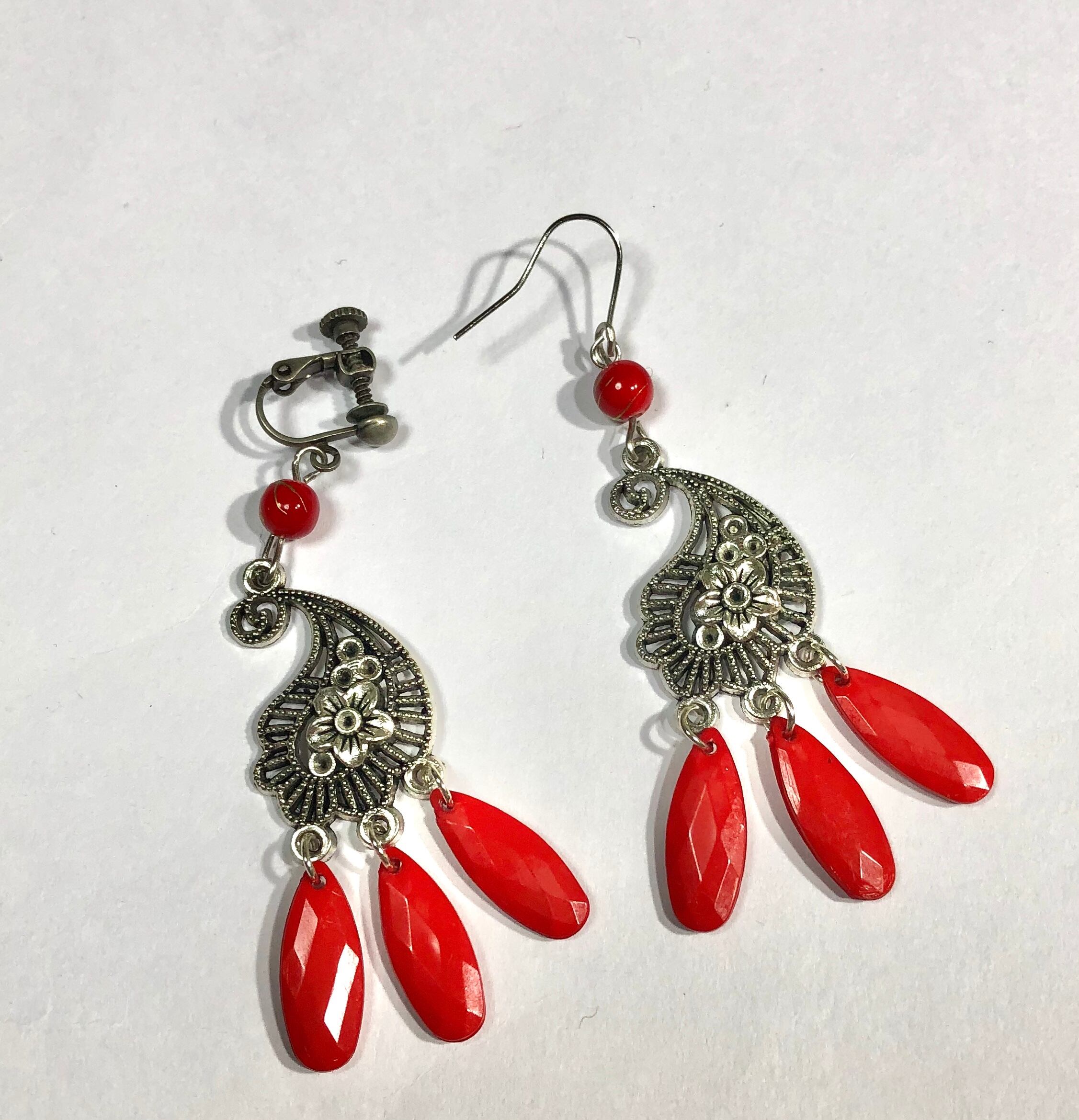 コーラルレッドのコントラストが綺麗なフラメンコ用じゃらじゃらイヤリング